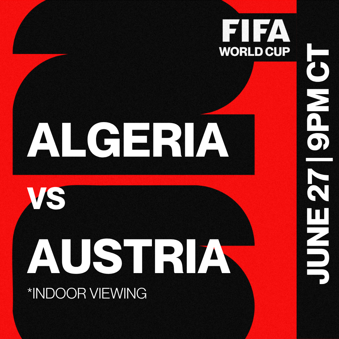Back to All Events ๐ฉ๐ฟ Algeria vs ๐ฆ๐น Austria Saturday, June 27, 2026 9:00โฏPM 10:00โฏPM Google Calendar ICS Watch Algeria vs Austria live at Recess Chicago, with big screens, booming sound, and a crowd thatโs energized for every goal, save, and moment of the match.
