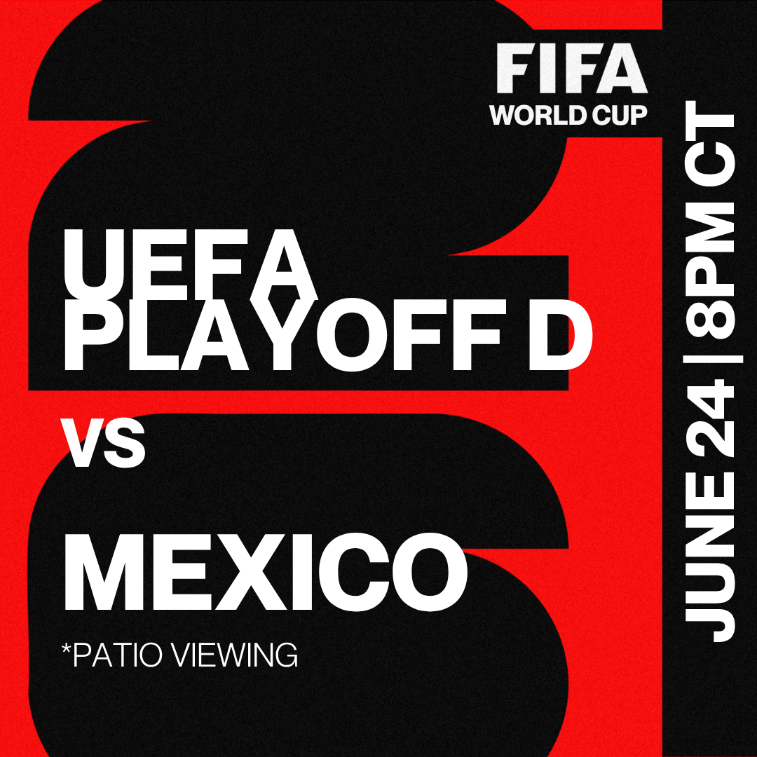 UEFA Playoff D vs 🇲🇽 Mexico Wednesday, June 24, 2026 8:00 PM 9:00 PM Google Calendar ICS Catch UEFA Playoff D vs Mexico live at Recess Chicago with full sound, massive screens, and a crowd that brings the energy from kickoff to the final whistle.